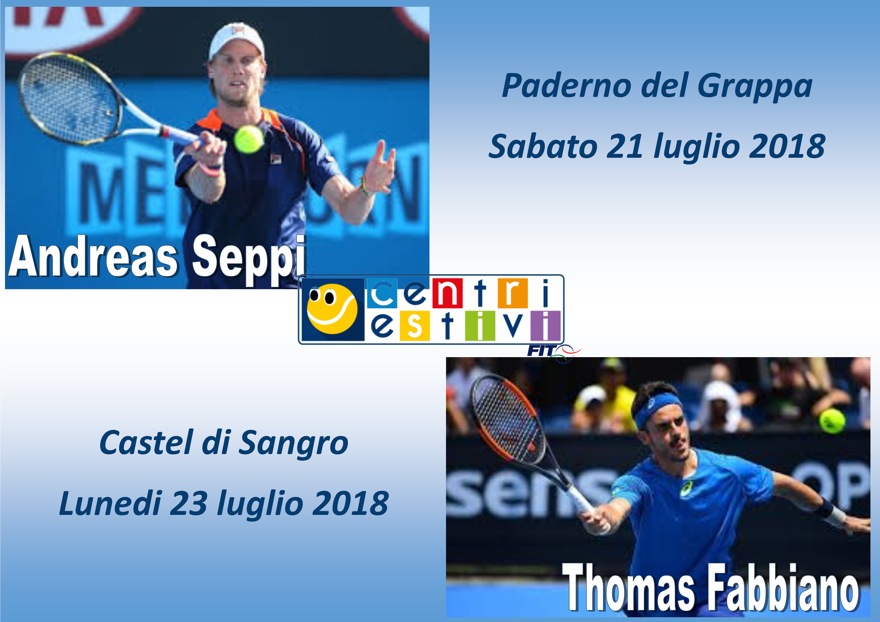 Dopo Roberta Vinci e Corrado Barazzutti, anche Andreas Seppi e Thomas Fabbiano saranno rispettivamente Sabato 21 Luglio a Paderno del Grappa e Lunedi 23 Luglio a Castel di Sangro.